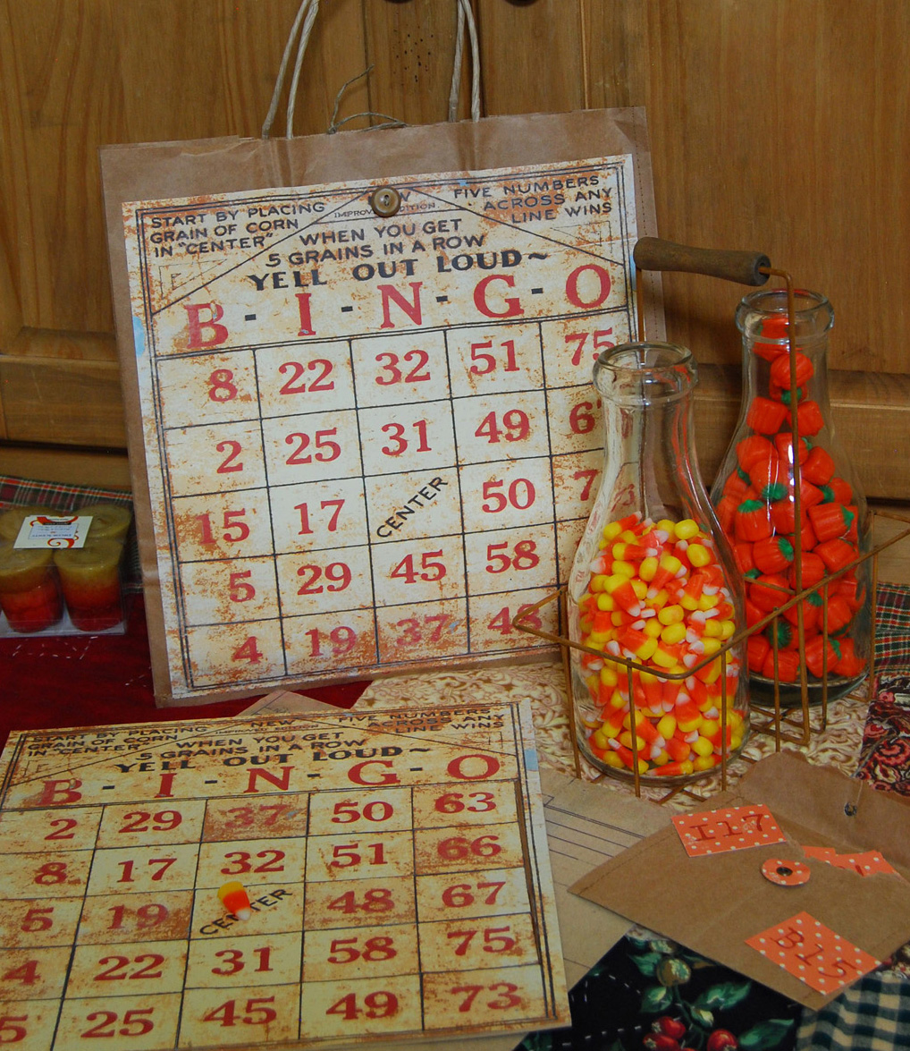 Create a family bingo game with copies of photos of family members. This is a good way for the children to learn about their ancestors. You may use vintage scrapbook paper and cardstock. This game uses candy corn for markers. Have the family pitch in by bringing plenty of small gifts and toys for prizes.